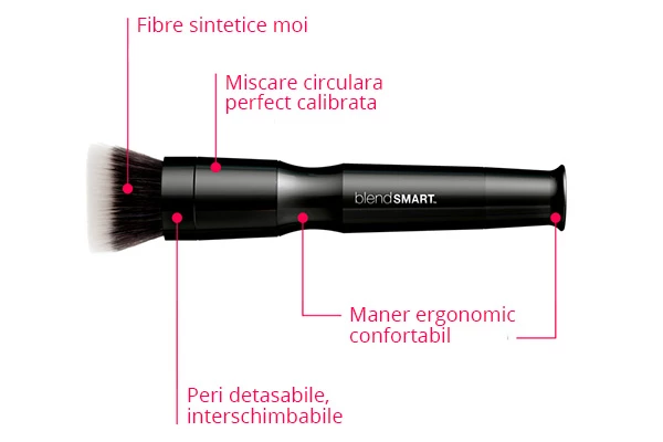 Blendsmart este un sistem de aplicare rotativ care iti va schimba viata in bine! Aceasta perie dispune de un cap rotativ interschimbabil, care mimeaza miscarile makeup artistilor profesionisti si astfel, reuseste sa ofere o aplicare perfecta a fondului de ten, a pudrei si a blush-ului. Cu 190 de rotatii pe minut, la 360 de grade, Blendsmart reuseste sa acopere in cel mai scurt timp o suprafata mai mare a tenului, lasandu-l neted, uniform si cu aspect de airbrush, iar tu nu vei mai avea de facut nici o ajustare, deoarece aceasta nu lasa urme sau pete, si intinde uniform baza de machiaj, fie ca aceasta este sub forma de pudra, lichid sau crema.