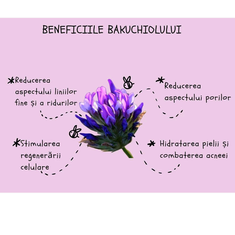 Bakuchiolul reprezinta alternativa 100% naturala si vegana, neiritanta a retinolului. Pastreaza proprietatile antioxidante, antiinflamatorii si antibacteriene ale retinolului, accelereaza reinnoirea celulara, stimuleaza productia de colagen si reduce ridurile.