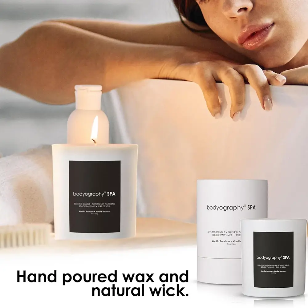 Transforma-ti spatiul intr-un sanctuar al relaxarii cu lumanarea parfumata Bodyography SPA Scented Candle din ceara naturala de soia. Infuzata cu un parfum seducator de Vanilla Bourbon, aceasta creeaza o atmosfera calda si reconfortanta, perfecta pentru momentele tale de rasfat. Fiecare lumanare este turnata manual si are fitil natural, asigurand o ardere curata si uniforma.