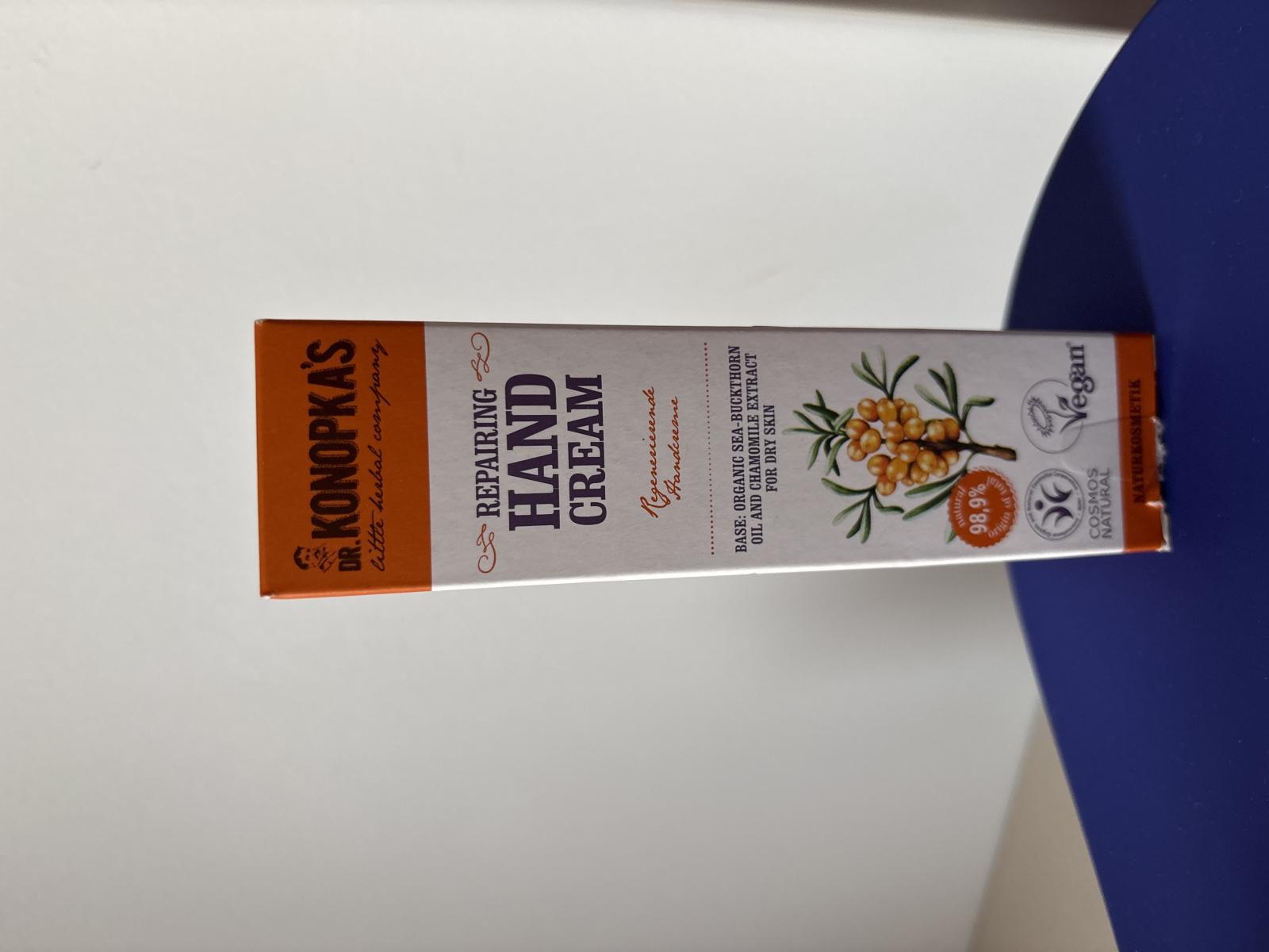 Crema pentru maini semnata Dr. Konopka este produsul pe care trebuie sa-l ai mereu la indemana pentru hidratarea mainilor si pentru a le asigura un aspect desavarsit. Aceasta crema naturala este bazata pe retetele Dr. Konopka si este ideala pentru pielea uscata. Uleiul organic de catina hraneste profund pielea, o ajuta sa ramana hidratata in permanenta si faciliteaza regenerarea pielii, iar extractul de musetel calmeaza si inmoaie pielea. Este un produs vegan, certificat COSMOS NATURAL.