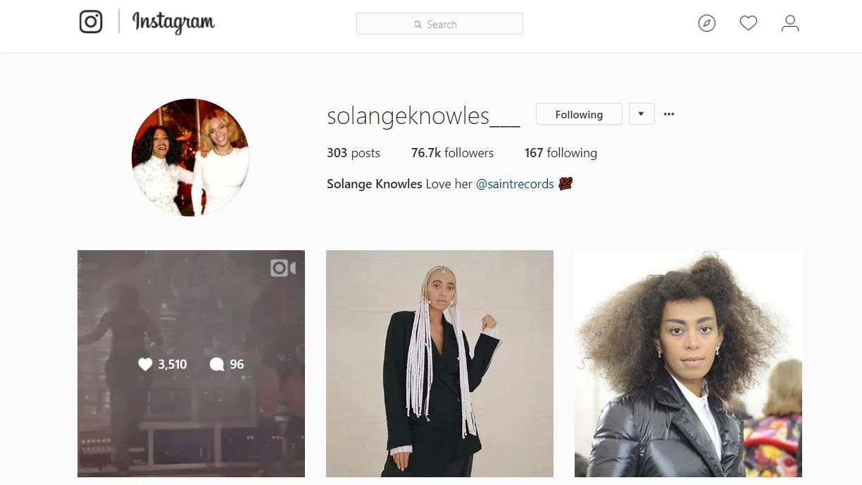 Ce posteaza: Ah, veti vedea cele mai cool tinute cu care Solange se afiseaza pe covorul rosu si cele mai tari rochii de scena. (Nu doar pozele, ci si piesele lui Solange ne plac foarte mult, dar sa nu ii spuneti surorii sale mai mari!)