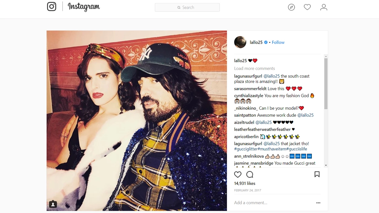 Ce posteaza: Oh, greu de descris! Un mix absolut genial de fotografii de atmosfera, cu decoruri somptuoase si baroce (de altfel surse de inspiratie pentru colectiile Gucci), arta renascentista, imagini in care apare inconjurat de fashion-people si, bineinteles, poze incredibil de simpatice cu catelul sau.