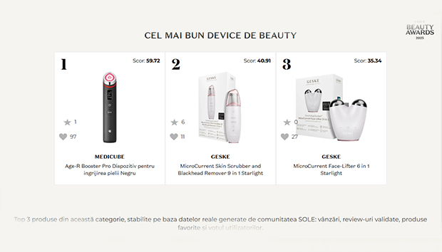 Categoria  Best Beauty Device  din SOLE Beauty Awards 2025 a adunat 15 dispozitive care demonstrează diversitatea tehnologiilor moderne în skincare la domiciliu — de la dispozitive de curățare cu microcurenți la rollere faciale cu vibracii sonice, de la aparate de exfoliere mecanică la device-uri pentru volumizarea buzelor, de la tehnologii anti-aging la soluții pentru puncte negre. Dar cum au fost selectați câștigătorii într-o categorie atât de tehnologică și variată? Spre deosebire de premiile editoriale unde demonstrațiile spectaculoase domină, SOLE Beauty Awards evaluează performanța prin date măsurabile și comportamentul real al consumatorilor în utilizare pe termen lung. Acest articol explică procesul de selecție, criteriile decisive și de ce anumite device-uri au rezonat mai puternic cu comunitatea decât altele, oferind context pentru utilizatorii care vor să înțeleagă ce diferențiază câștigătorii de restul competitorilor și dacă investiția în tehnologie merită pentru nevoile lor specifice.