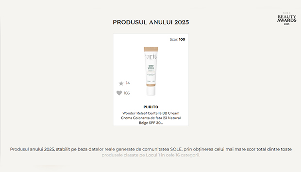 Dintre toate produsele evaluate în SOLE Beauty Awards 2025  un singur produs a obținut scorul perfect 100/100 și titlul de Produsul Anului :  Purito Wonder Releaf Centella BB Cream SPF 30 PA++ în nuanța 23 Natural Beige . Acest rezultat nu e aleatoriu sau bazat pe popularitate momentană, ci reflectă performanța excepțională pe toate cele patru categorii de evaluare — vânzări susținute, review-uri verificate, adăugări în favorite și vot comunitate. Dar ce face ca o BB cream să depășească seruri concentrate, creme anti-aging premium sau device-uri tehnologice avansate? Acest articol explică procesul de selecție a Produsului Anului, criteriile decisive și de ce Purito Wonder Releaf Centella BB Cream 23 Natural Beige a rezonat atât de puternic cu comunitatea SOLE încât să obțină unanimitate absolută — ceva rar întâlnit chiar și în competiții beauty globale.