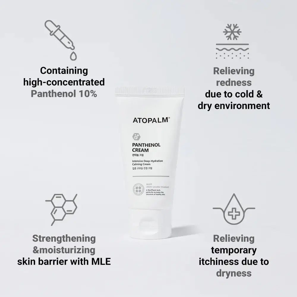 Atopalm Panthenol Crema Calmanta pentru Piele Atopica, 10% B5 (80 ml) — Crema oferă hidratare de până la 72 de ore, fiind special formulată pentru piele atopică și sensibilă, cu un conținut de 10% pantenol care calmează iritațiile.