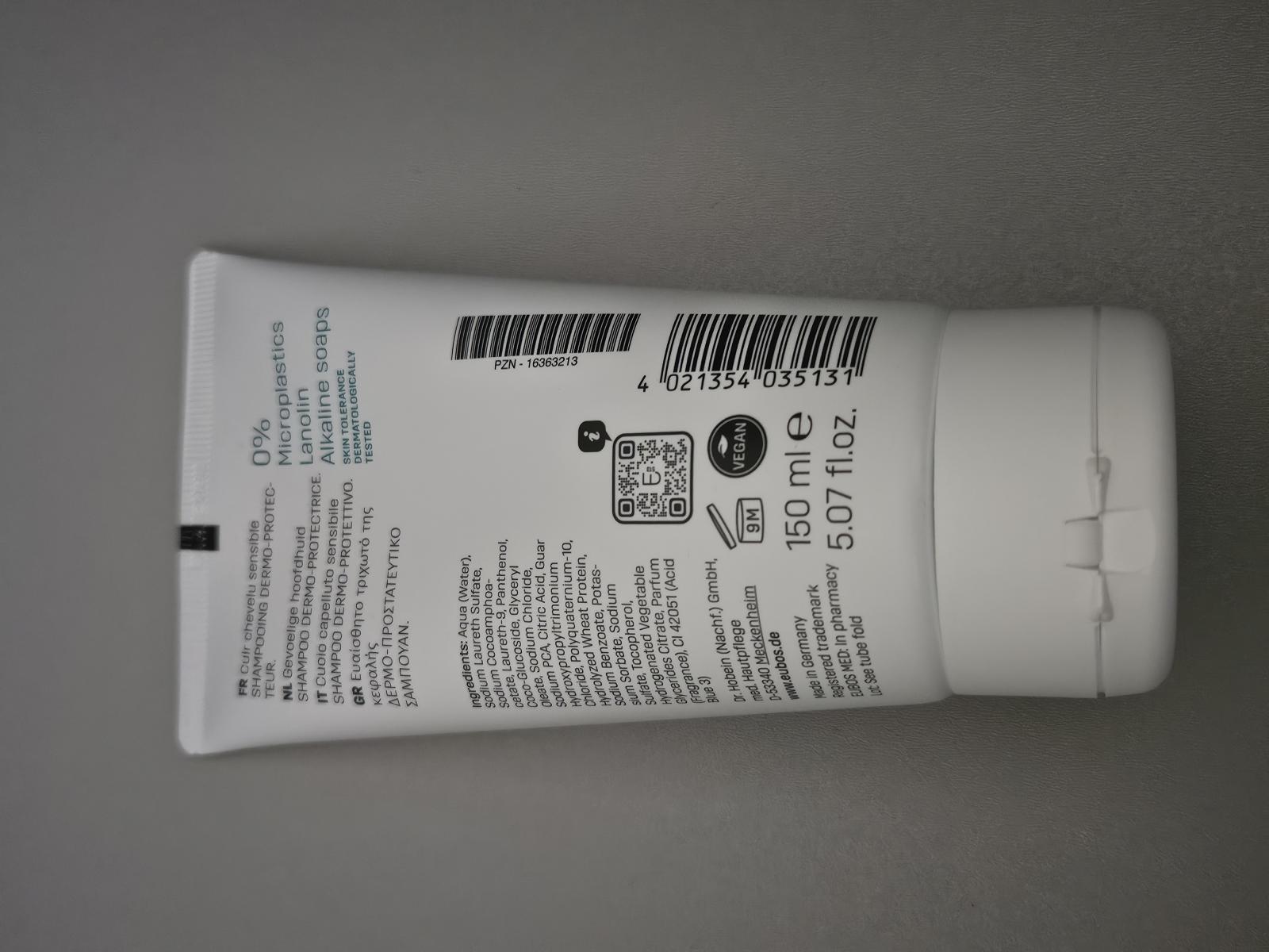 Samponul EUBOS Sensitive Care Shampoo Dermo-Protective pentru scalp sensibil ofera o curatare blanda, menita sa mentina confortul scalpului si aspectul ingrijit al parului. Formula este conceputa pentru a calma si a revitaliza zonele sensibile, fiind potrivita inclusiv pentru scalp uscat sau pentru par care se electrizeaza sau se incurca usor.