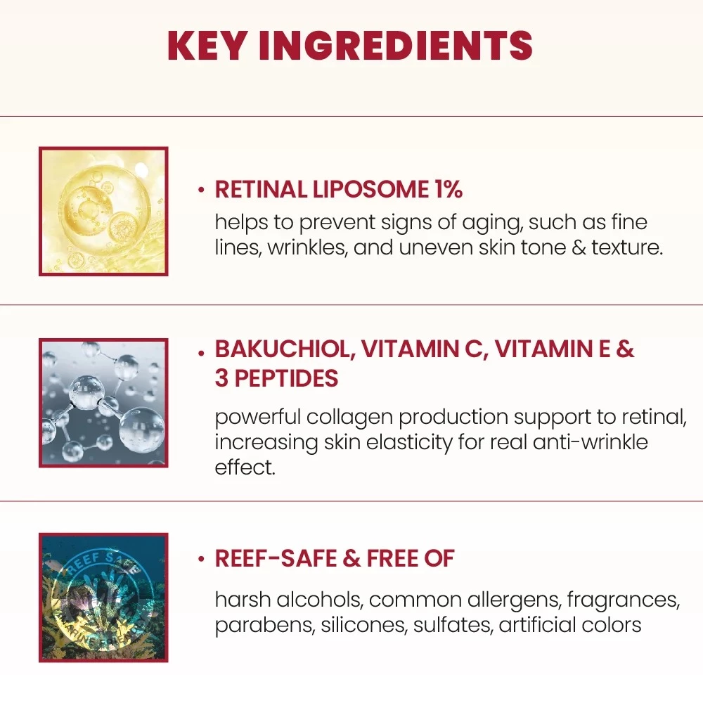 Cremă de îngrijire zilnică cu 1% retinal încapsulat în lipozomi și extracte fermentate din orez și plante, destinată combaterii semnelor vizibile ale îmbătrânirii, precum ridurile și hiperpigmentarea.