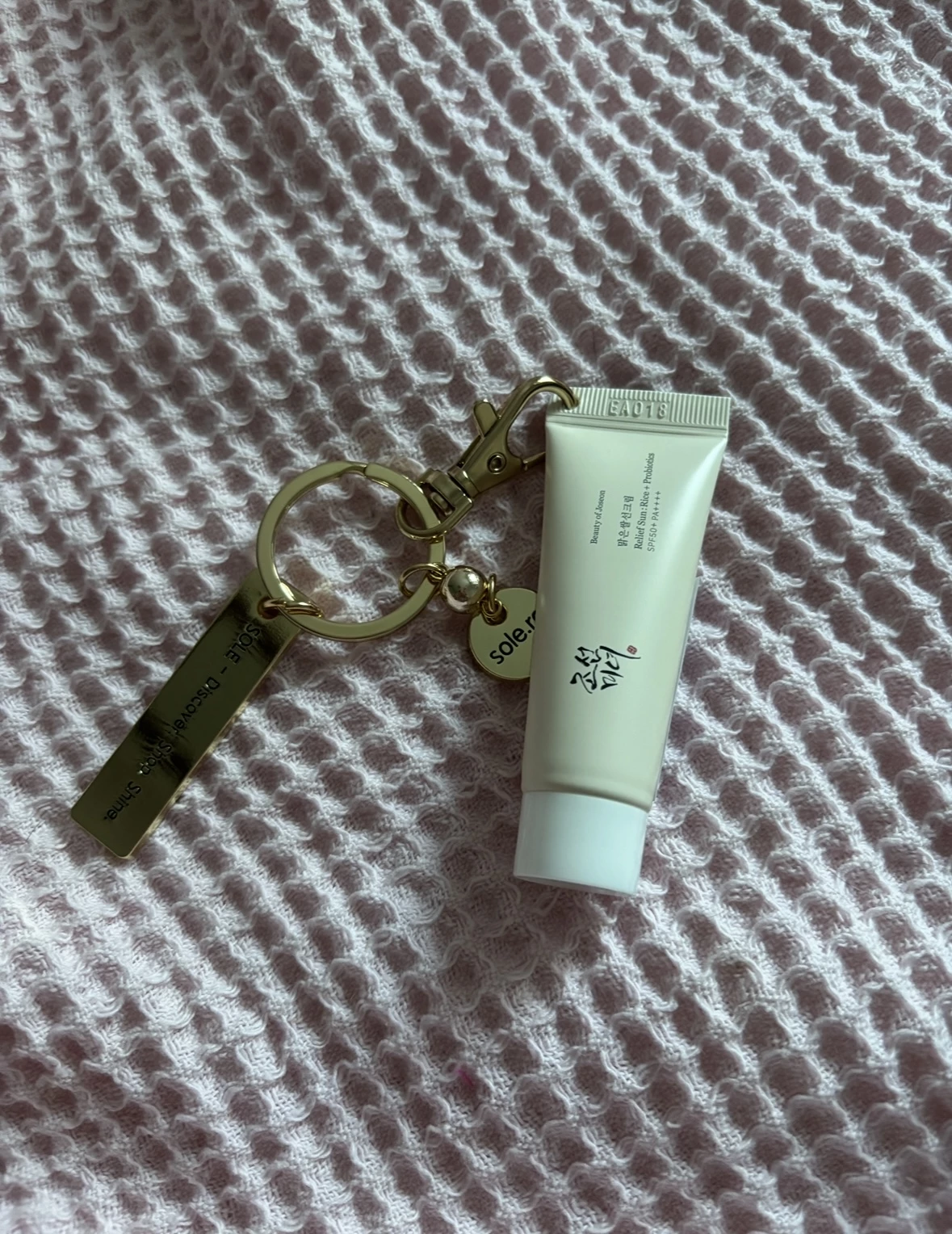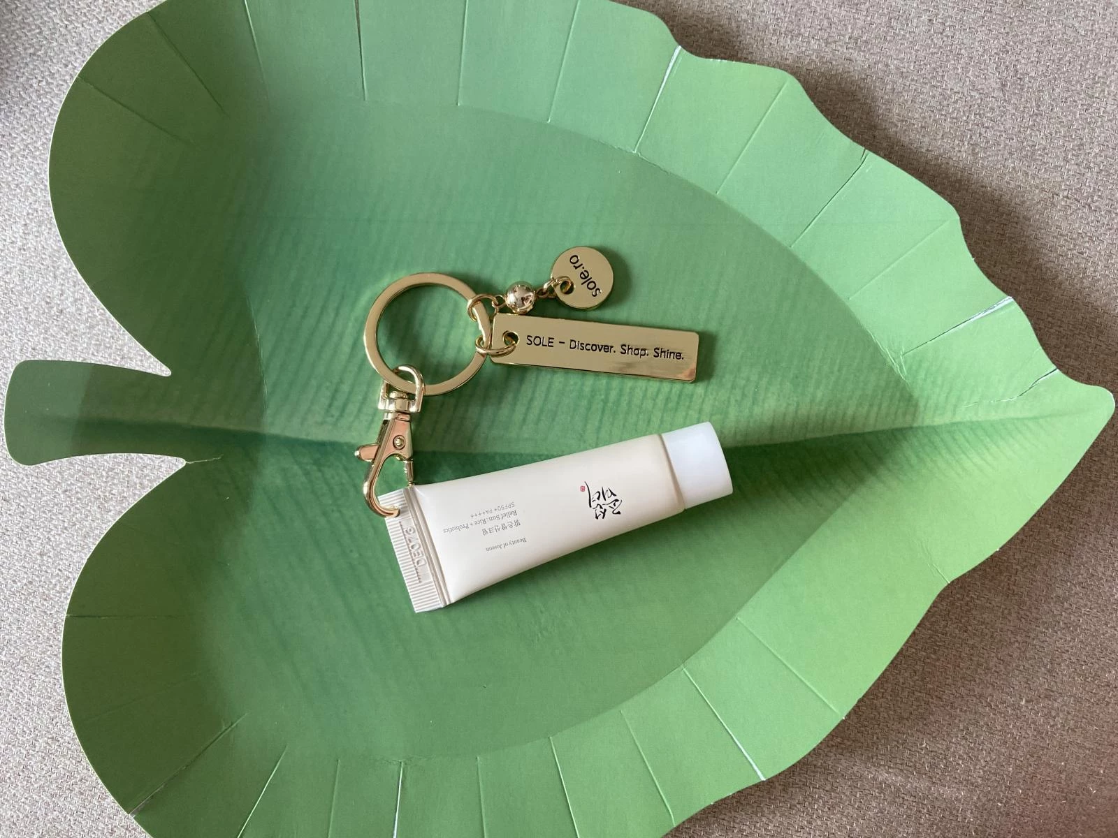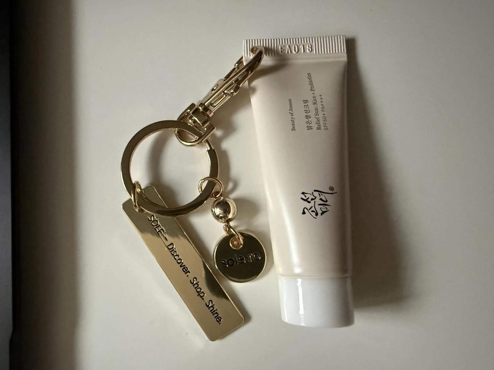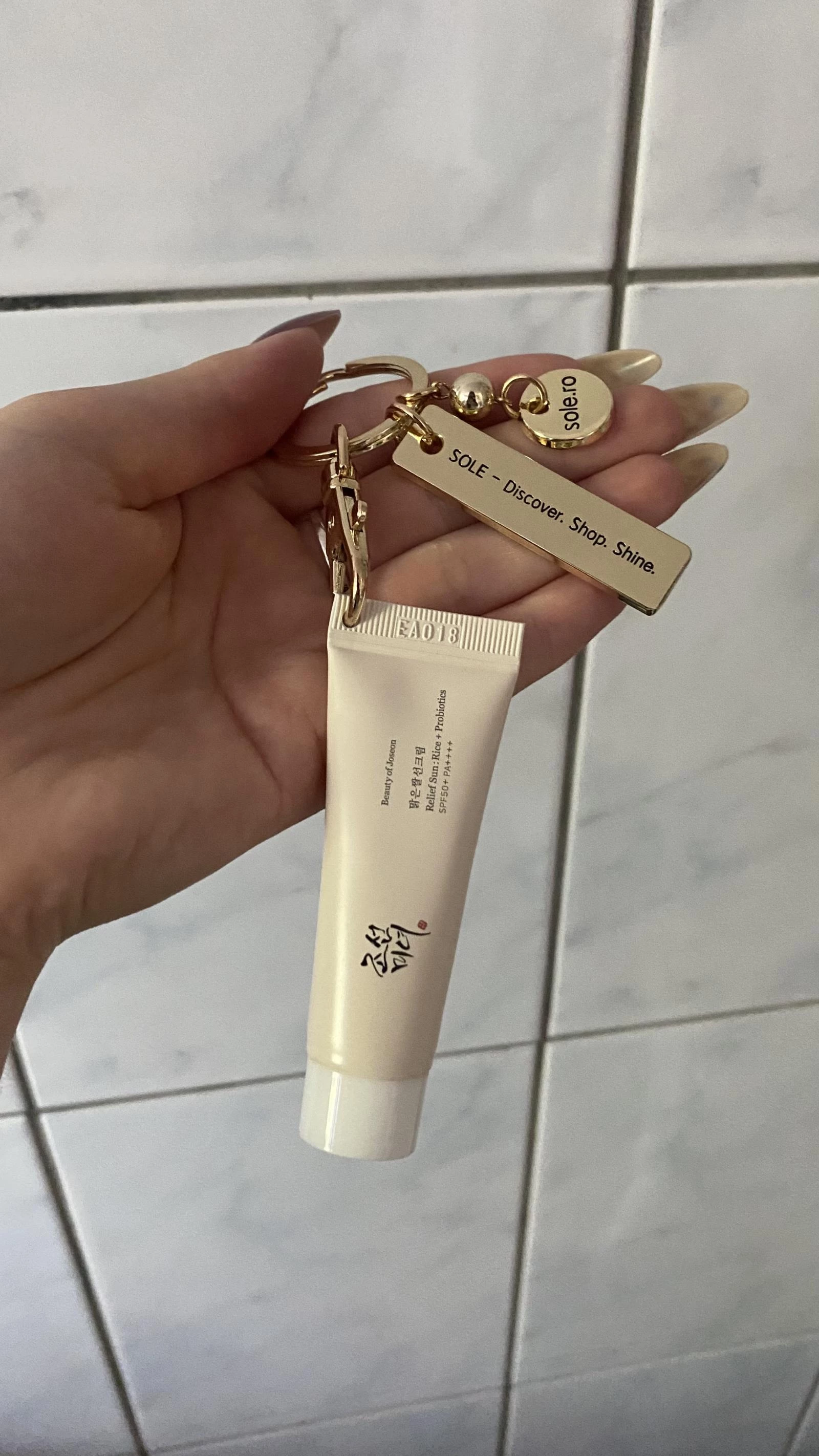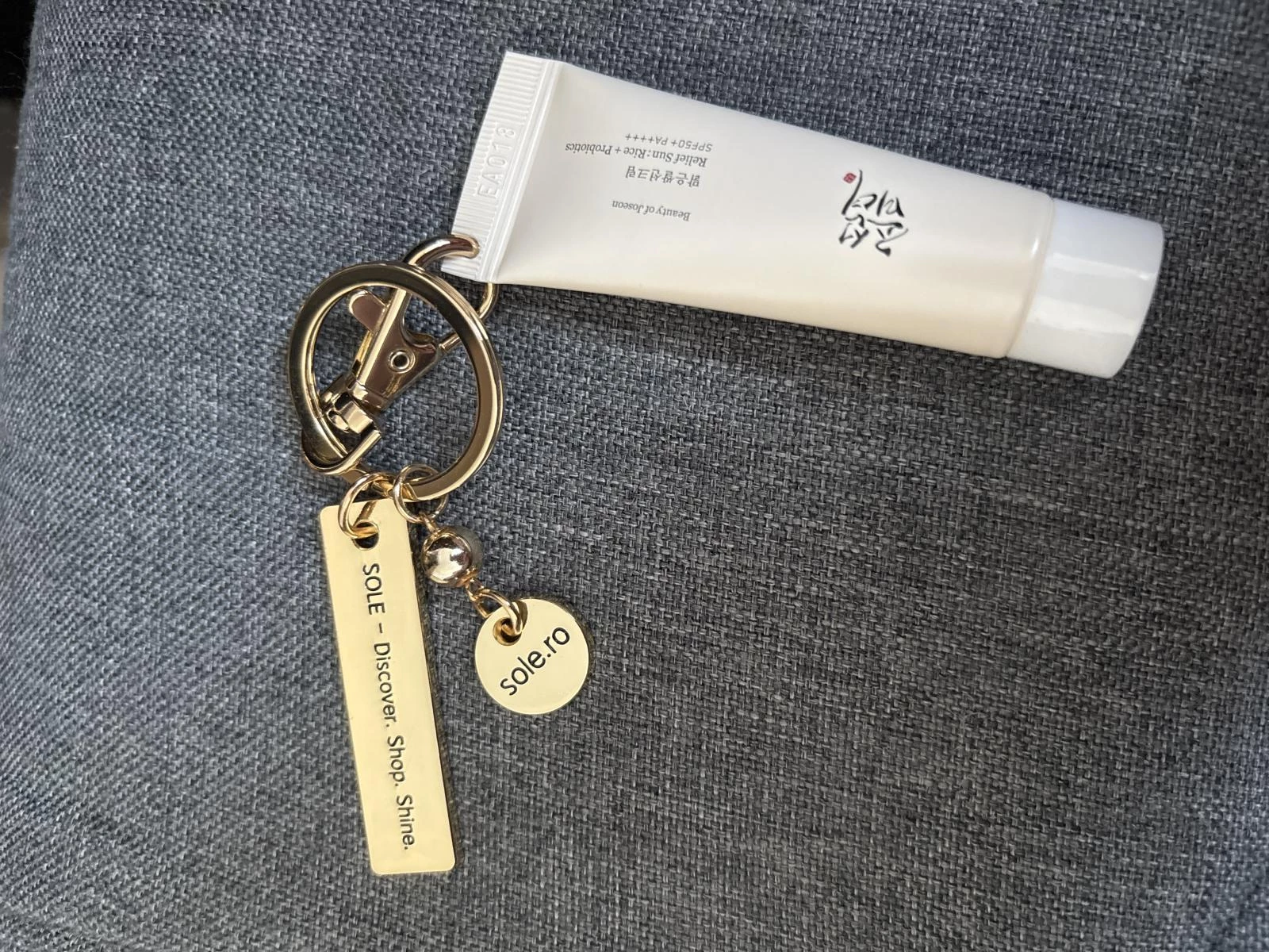 Transforma-ti rutina zilnica de ingrijire intr-un moment chic si sofisticat oriunde te-ai afla cu crema de protectie solara mini-size Beauty of Joseon - Relief Sun: Rice + Probiotics Sunscreen SPF 50+ PA++++ (10 ml), acum insotita de brelocul auriu premium SOLE, in editie limitata.