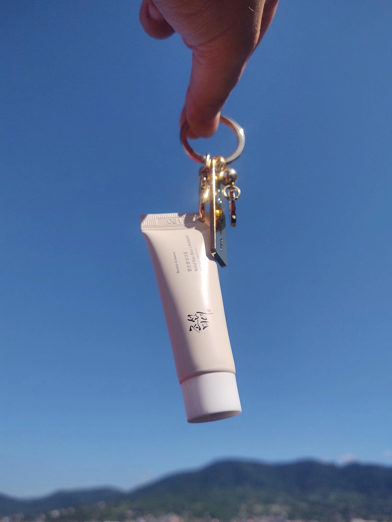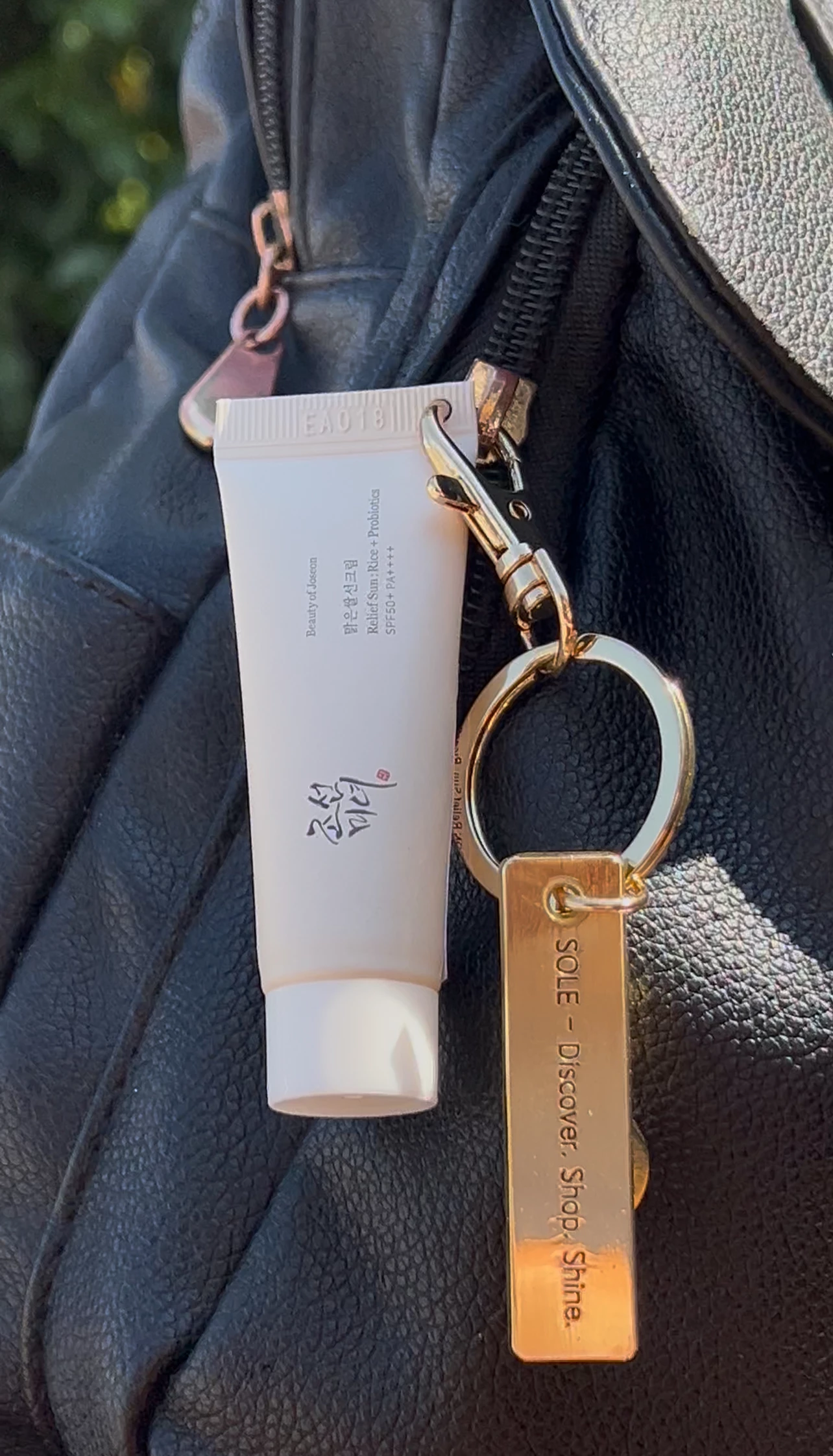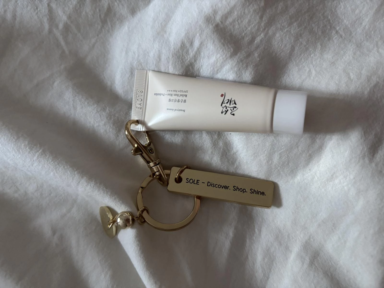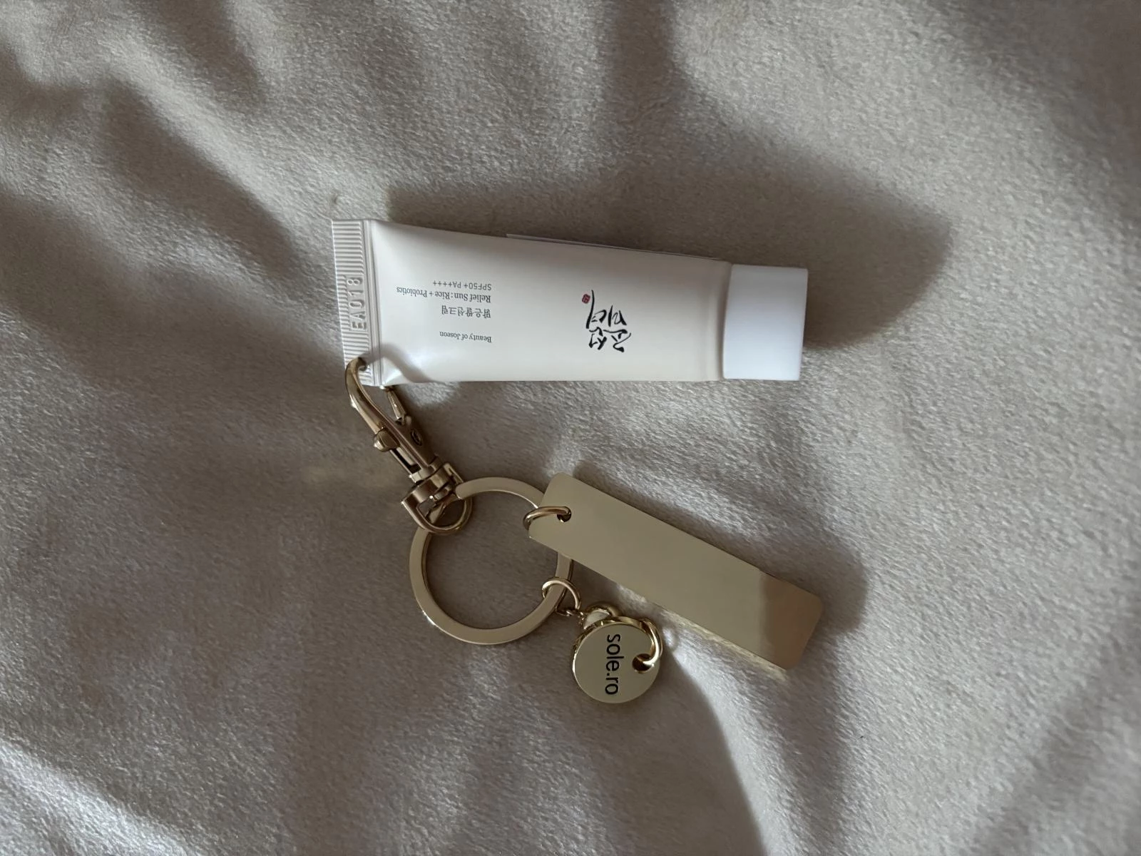 Transforma-ti rutina zilnica de ingrijire intr-un moment chic si sofisticat oriunde te-ai afla cu crema de protectie solara mini-size Beauty of Joseon - Relief Sun: Rice + Probiotics Sunscreen SPF 50+ PA++++ (10 ml), acum insotita de brelocul auriu premium SOLE, in editie limitata.