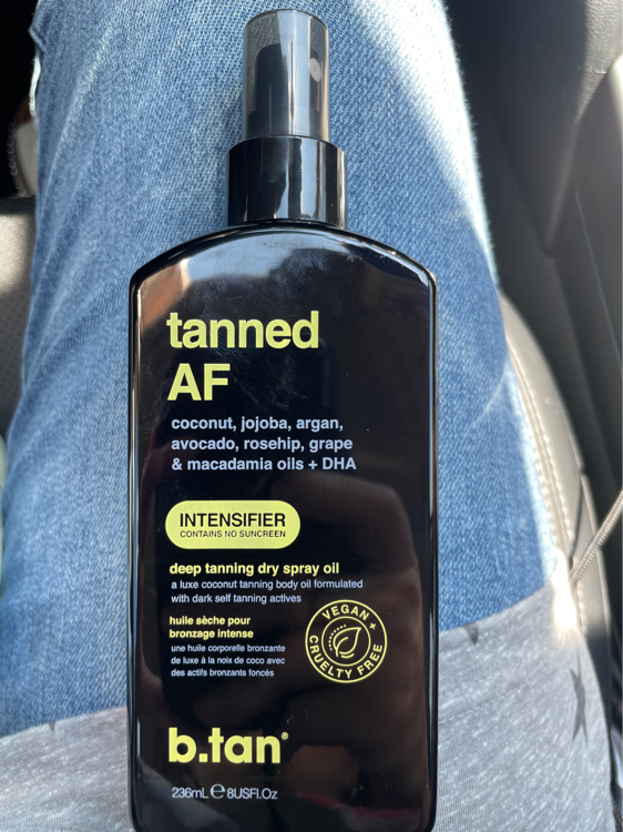 b.tan tanned af - deep tanning dry spray oil este un ulei de corp pentru plaja, formulat cu active de accelerare a bronzului pentru rezultate de bronzare mai profunde si mai intunecate ca niciodata, cu mai putin timp petrecut la soare. Formula sa este imbogatita cu 7 uleiuri ultra-hidratante, cum ar fi nuca de cocos, argan, avocado, trandafir, macadamia, jojoba + ulei de seminte de struguri.
