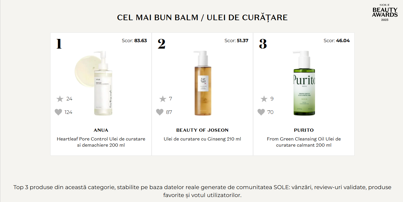 Indiferent de preferință (oil vs. balm, clean beauty vs. eficiență maximă, accesibilitate vs. experiență premium), nominalizații oferă opțiuni validate de mii de utilizatori reali — eliminând ghicitul din primul pas crucial al rutinei de skincare. Rezultatele complete ale categoriei, inclusiv scorurile detaliate pentru toți cei 13 nominalizați, sunt disponibile la sole.ro/sole-beauty-awards-2025.