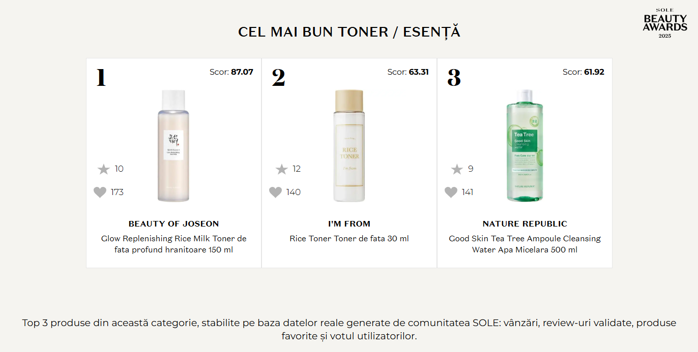 Categoria Best Toner/Essence din SOLE Beauty Awards 2025 demonstrează maturizarea sofisticată a pieței românești — consumatorii nu mai caută "cel mai bun toner universal", ci înțeleg că alegerea depinde de tipul de ten, nevoile specifice și preferințele de textură. Cei trei câștigători ai votului comunității — Beauty of Joseon Glow Replenishing Rice Milk Toner, I'M FROM Rice Toner și Nature Republic Tea Tree Ampoule Cleansing Water — au rezonat puternic datorită combinației de eficiență validată, experiență senzorială superioară și adaptabilitate la diverse rutine.