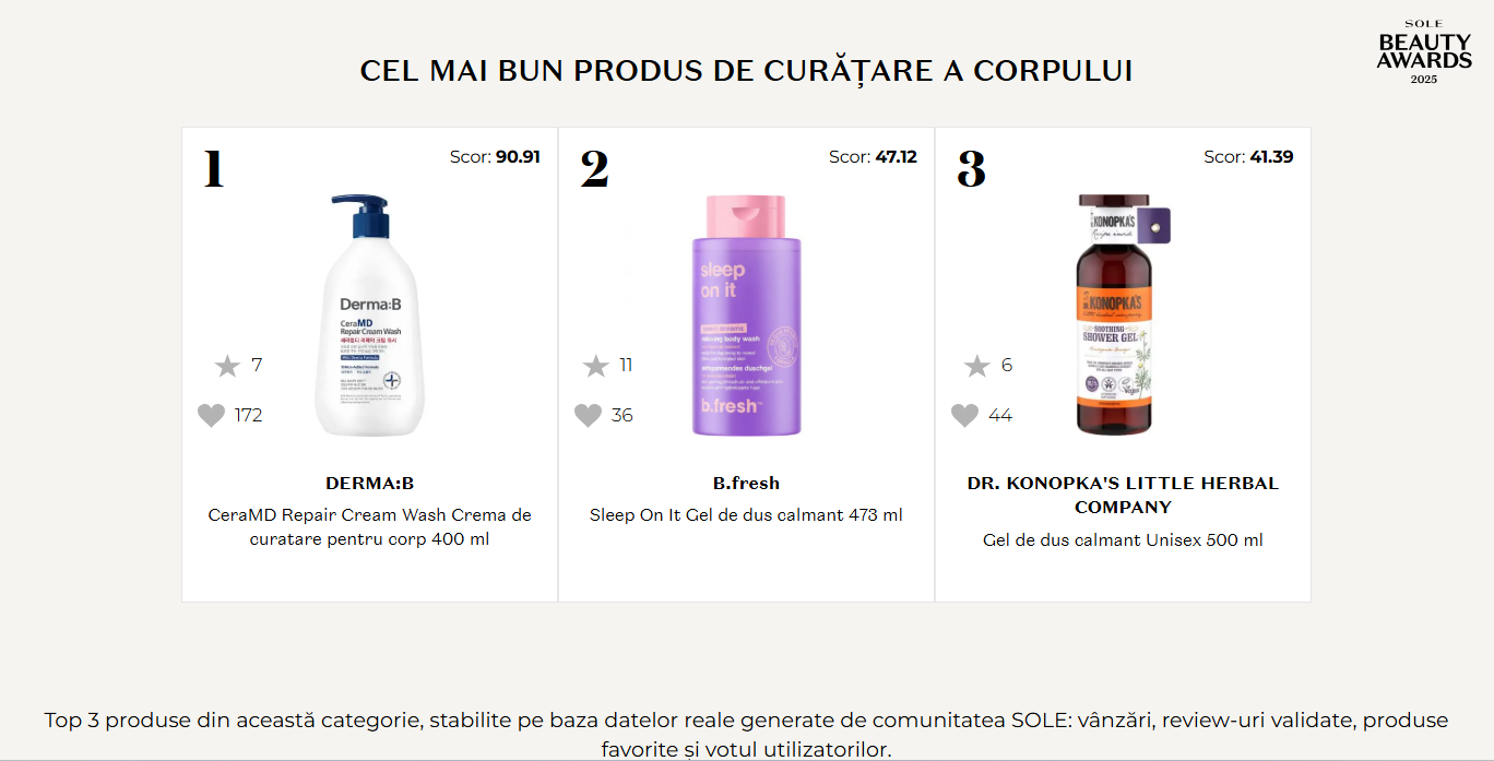 SOLE Beauty Awards 2025 categoria Best Body Cleanser validează 15 produse prin date măsurabile — vânzări susținute, review-uri verificate, interes organic și vot comunitate. Câștigătorii nu sunt aleși arbitrar, ci reflectă produsele care oferă tratament dermatologic validated (ceramide pentru barieră), wellness experience (aromatherapy pentru relaxare) și versatilitate practică (unisex, value, daily use).