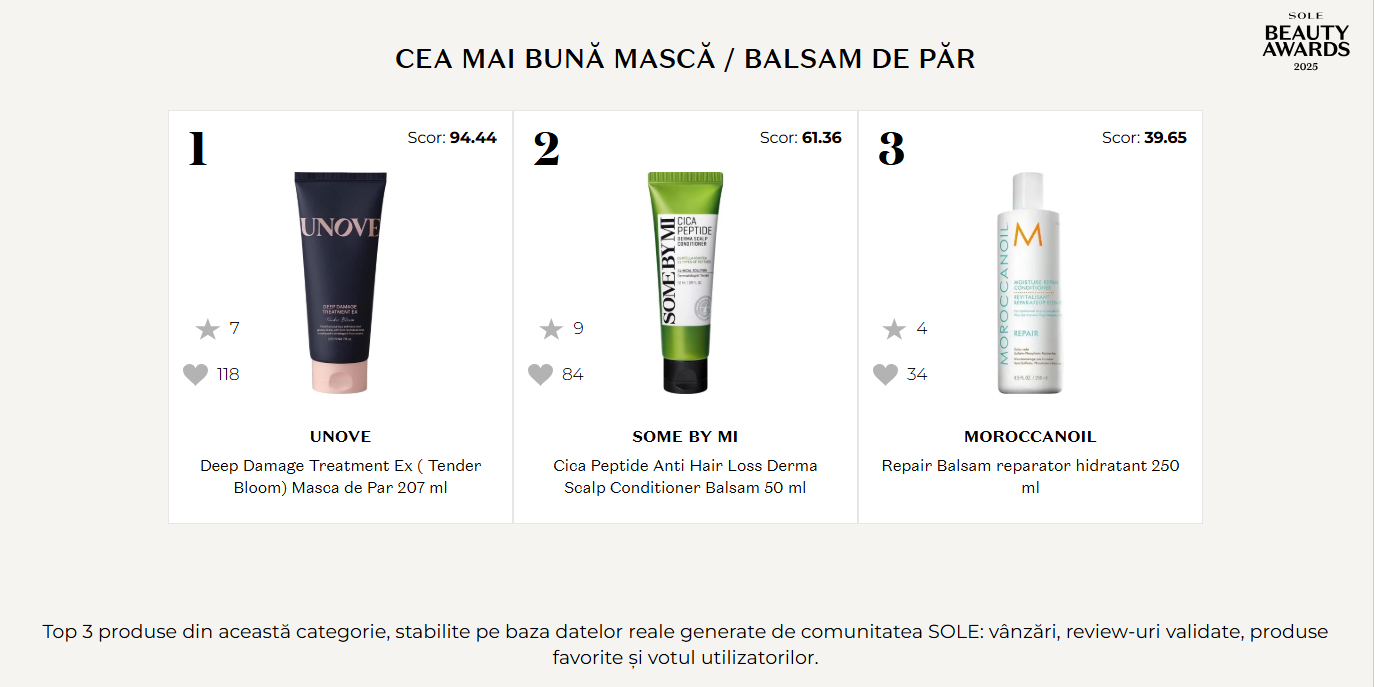 Top 3 — UNOVE Deep Damage Treatment Ex (Tender Bloom), SOME BY MI Cica Peptide Anti Hair Loss Derma Scalp Conditioner și Morrocanoil Repair Balsam reparator hidratant — au dominat prin specializări complementare (reparare extremă păr deteriorat vs. tratament scalp + anti-cădere vs. versatilitate daily/weekly universal), ingrediente validate (proteine + uleiuri + ceramide, Cica + peptide, formulă echilibrată) și rezultate transformative documentate de mii de utilizatori.