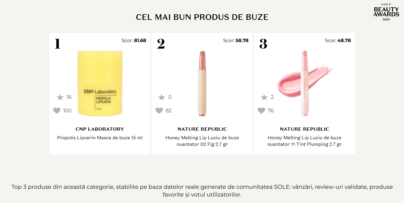 SOLE Beauty Awards 2025 categoria Best Lip Products validează 14 produse prin date măsurabile — vânzări susținute, review-uri verificate, interes organic și vot comunitate. Câștigătorii nu sunt aleși arbitrar, ci reflectă produsele care oferă echilibrul perfect între tratament (hidratare, reparare) și estetic (culoare, finish), plus confort maxim (texturi lightweight, non-sticky).
