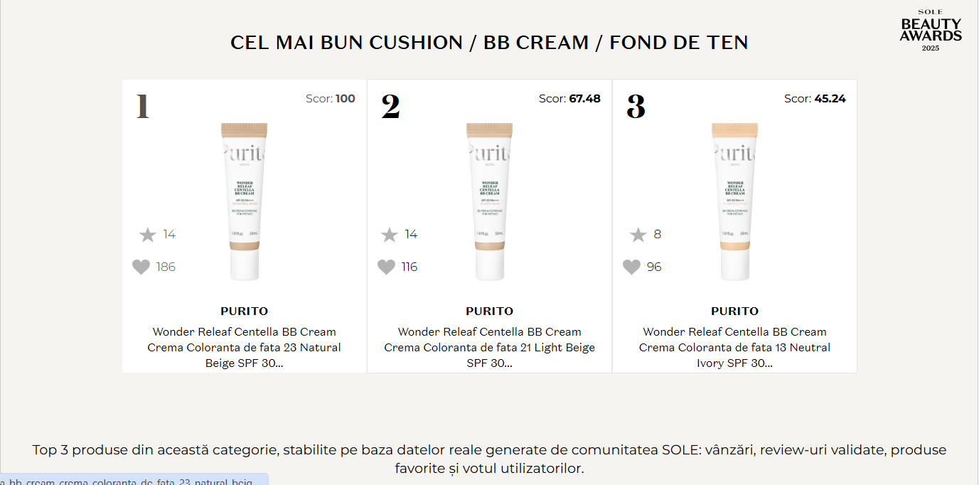 SOLE Beauty Awards 2025 categoria Best Cushion/BB Cream/Foundation validează 15 produse prin date măsurabile — vânzări susținute, review-uri verificate, interes organic și vot comunitate. Fenomenul unic al acestei categorii: același produs (Wonderleaf Centella BB Cream) ocupă primele 3 poziții în nuanțe diferite — demonstrează satisfacție extremă cross-nuanțe și validează că produsul funcționează excelent indiferent de tonul de piele.