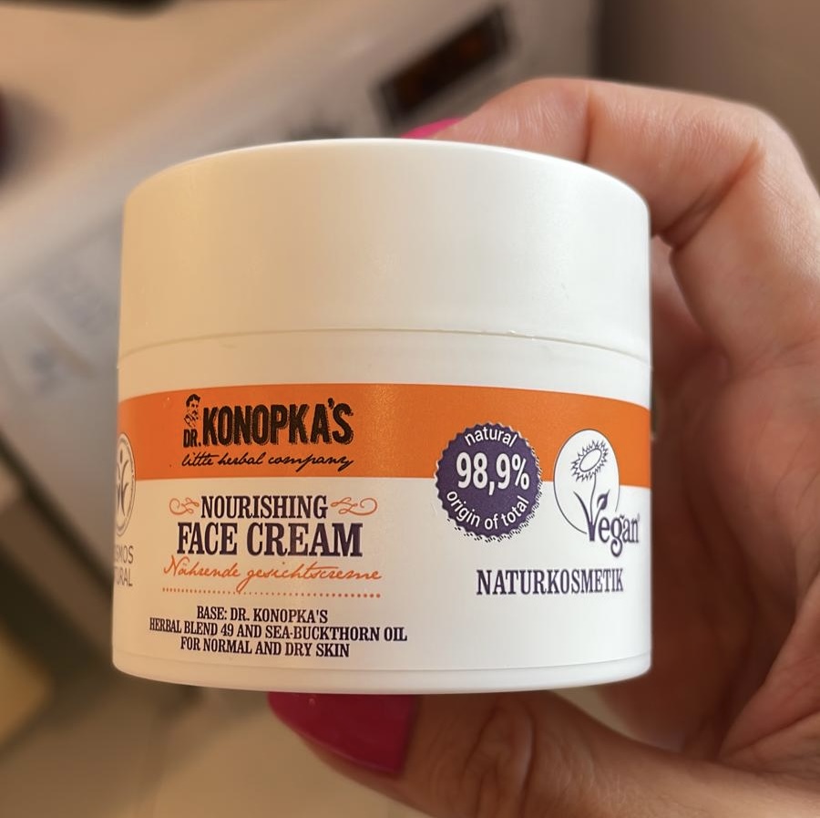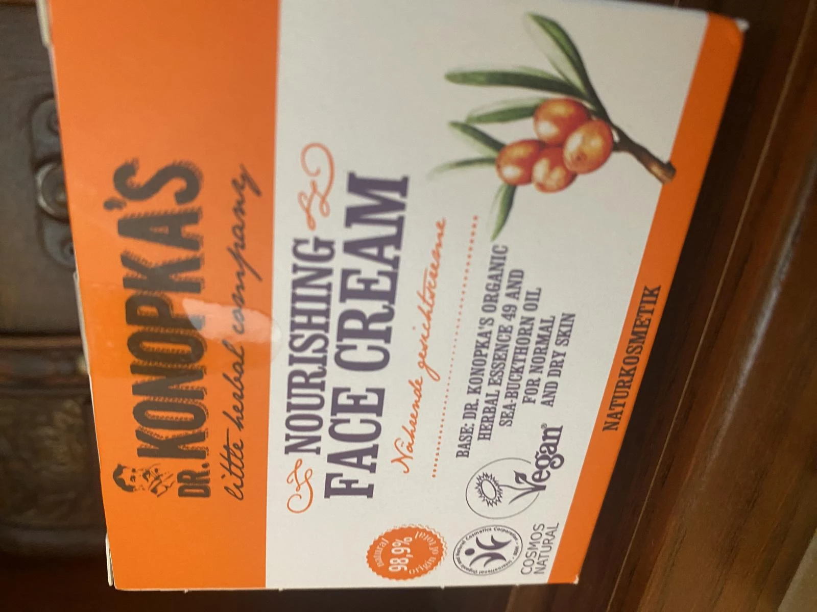 Aceasta crema de fata nutritiva foloseste esentele organice speciale din plante medicinale Dr. Konopka nr. 49 care lupta impotriva semnelor imbatranirii si esenta nr. 54 care ofera si mentine nivelul optim de hidratare al pielii. Cu vitamine si acizi esentiali pentru hranirea suplimentara si reconstructia pielii, aceasta crema este ideala pentru tenul normal sau uscat. Impreuna cu extractul de catina, aceasta crema ajuta la mentinerea hidratarii si protejeaza intens pielea impotriva factorilor externi, lasand pielea neteda si moale. Este un produs vegan, certificat COSMOS NATURAL.