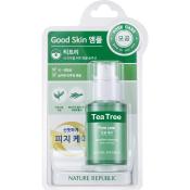 Nature Republic Good Skin Tea Tree Ampoule este un ser special formulat pentru a controla excesul de sebum si a improspata tenul, lasand pielea mata si catifelata. Infuzat cu ulei de arbore de ceai (Tea Tree Oil), acesta ajuta la curatarea porilor si la mentinerea unui aspect revigorat si neted al pielii.