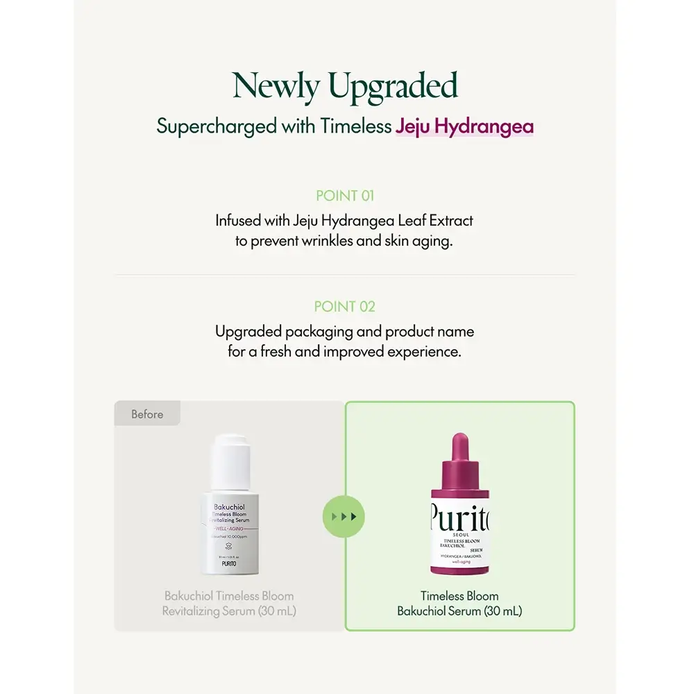 Descopera Serul Purito Timeless Bloom Bakuchiol, intr-o formula noua si un ambalaj fresh, imbogatit acum si cu extract de hortensie din Jeju. Bakuchiol actioneaza asupra reducerii ridurilor si imbunatatirii texturii pielii, in timp ce Jeju Hydrangea ofera un sprijin suplimentar in consolidarea pielii si imbunatatirea aspectului sau general. Acest efect sinergic ajuta la maximizarea beneficiilor serului in materie de fermitate, rezultand o piele mai sanatoasa si cu un aspect mai tanar.