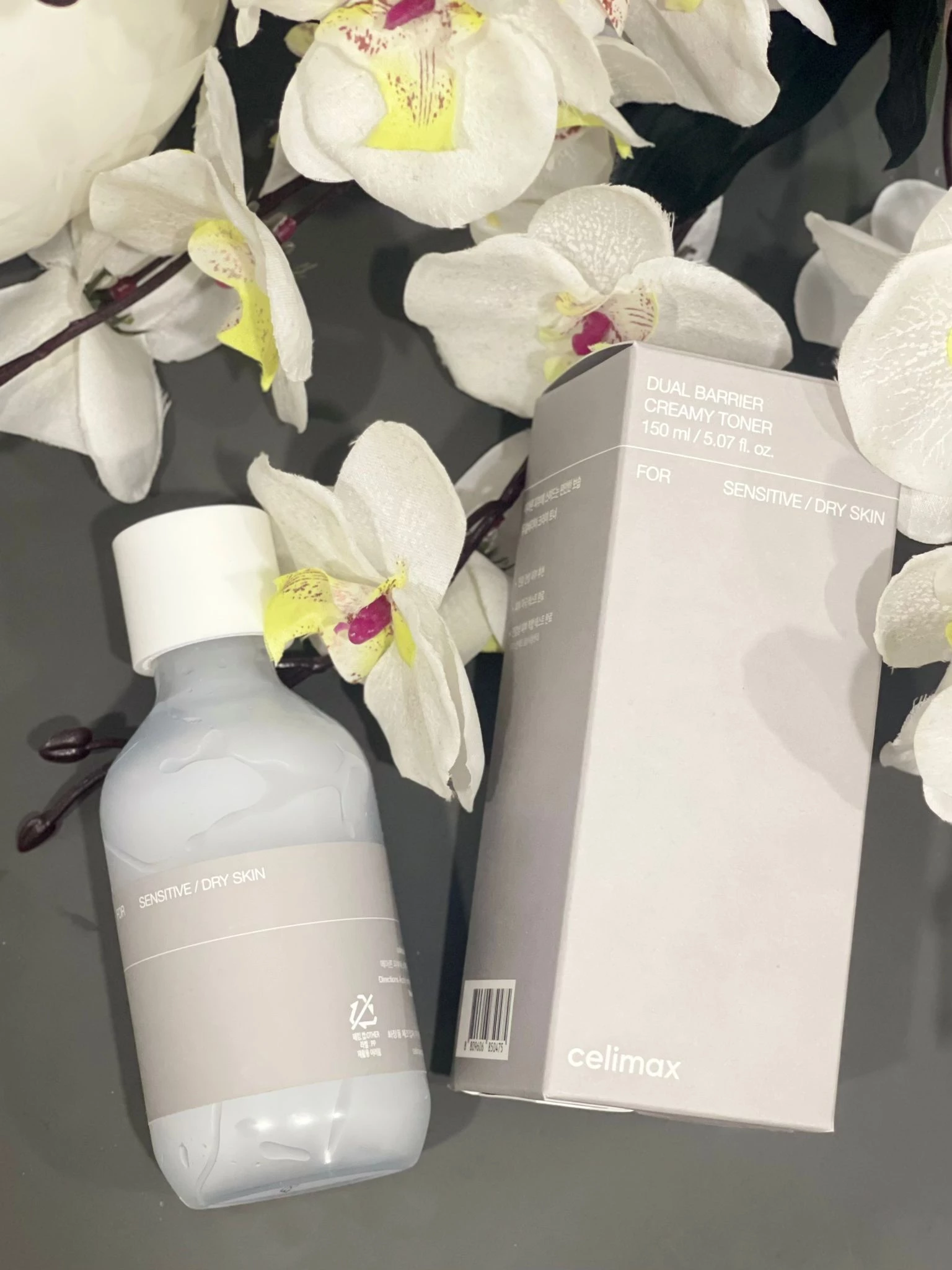 Celimax Dual Barrier Creamy Toner este un toner cremos, cu textura bogata si laptoasa, conceput special pentru pielea uscata, sensibila sau compromisa. Combinand beneficiile unui toner si ale unei creme hidratante, acesta ofera o hidratare profunda si de durata, intarind in acelasi timp bariera naturala de protectie a pielii.