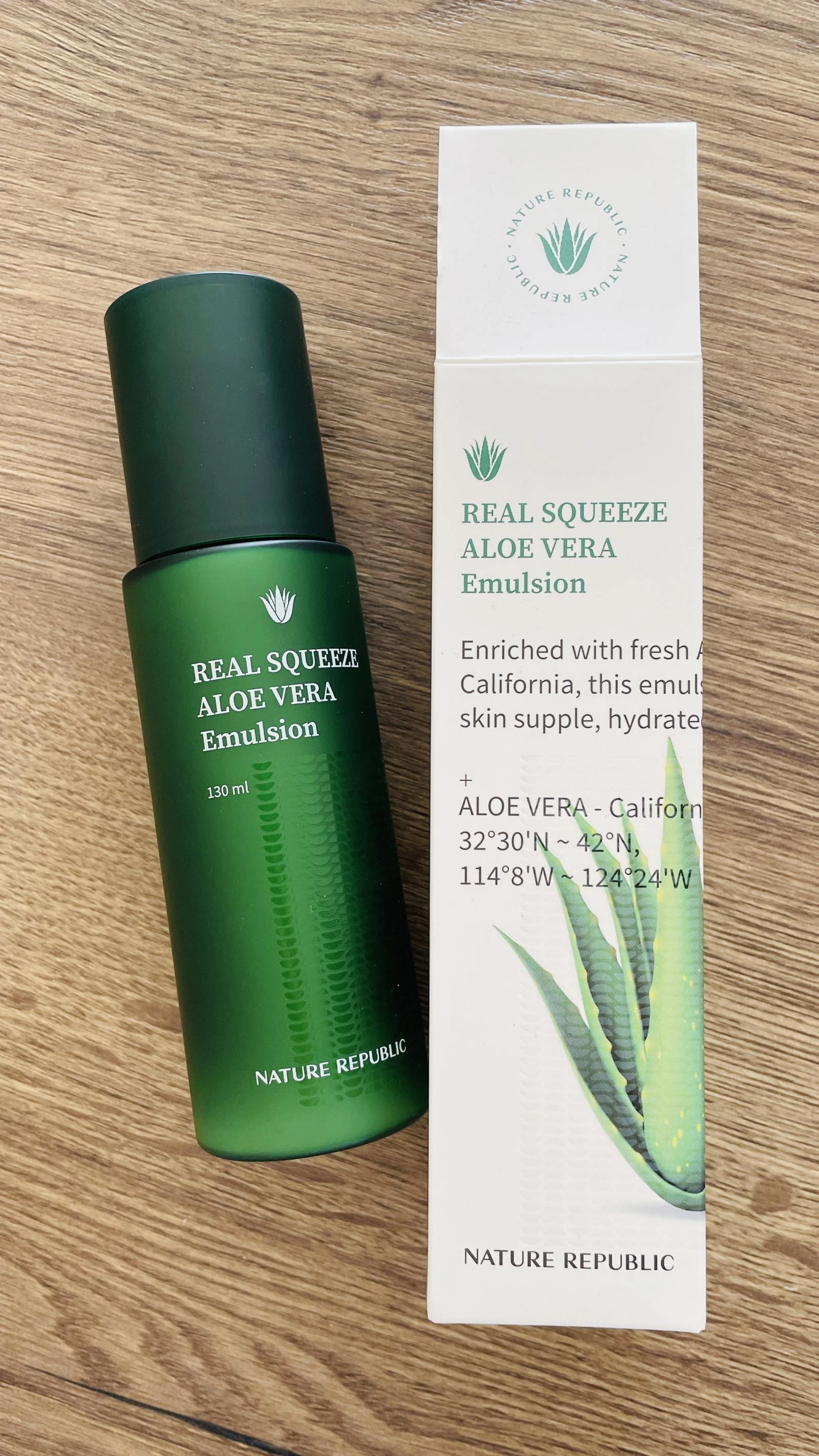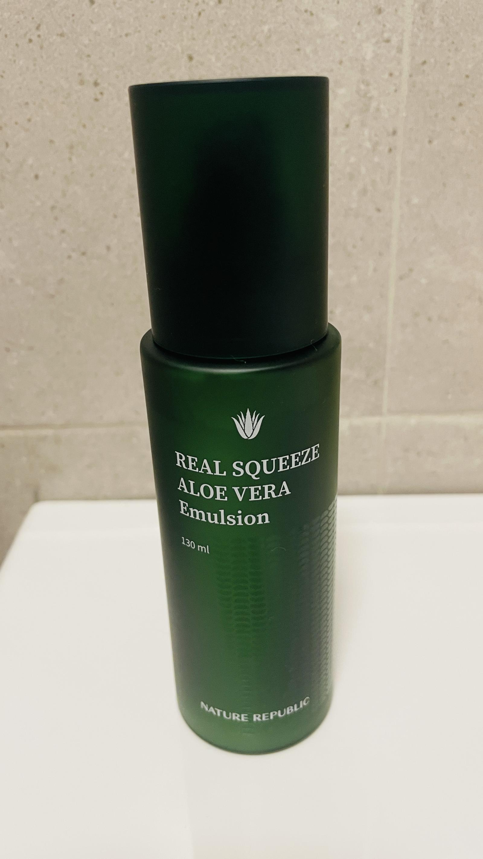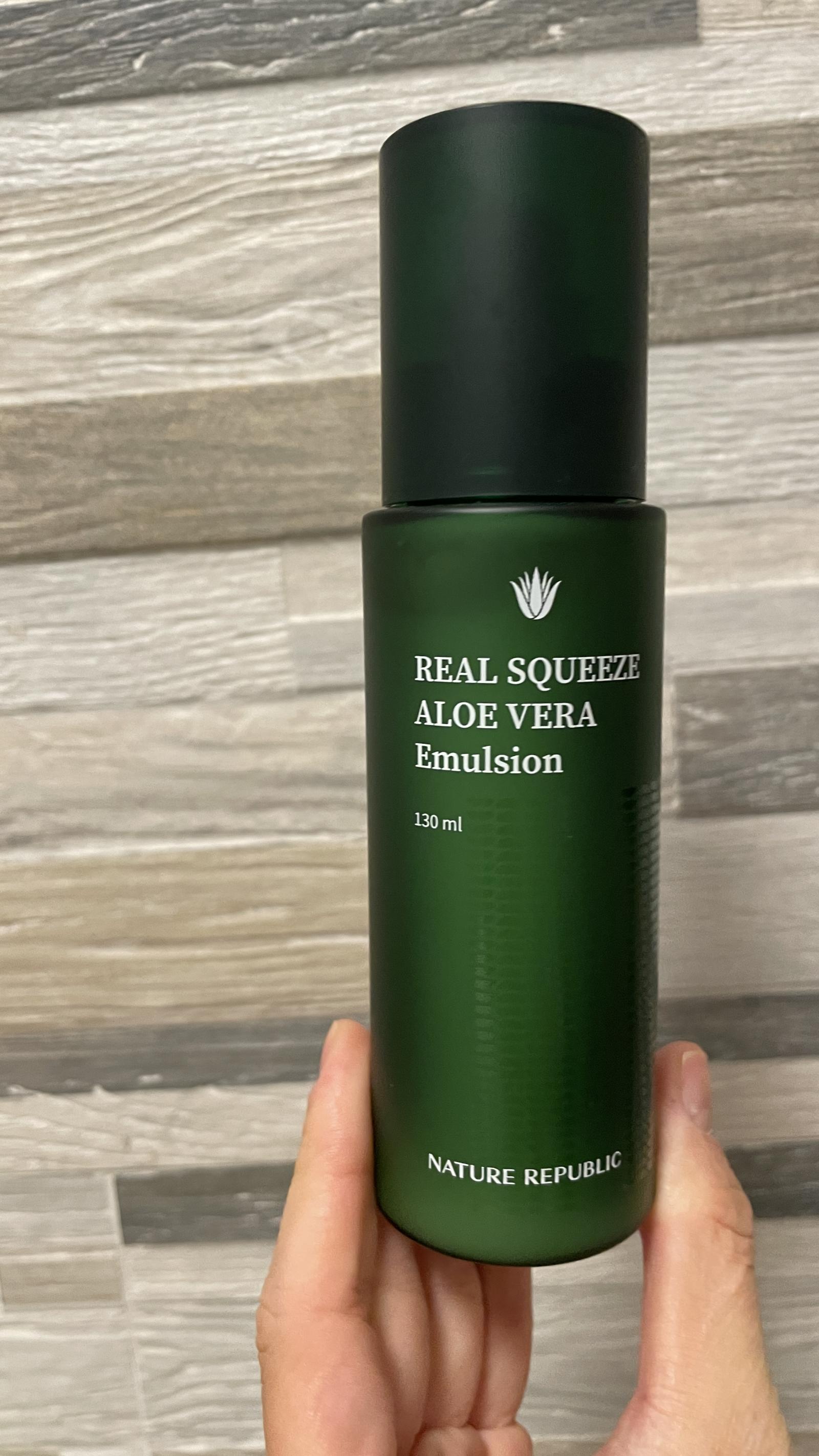 Nature Republic Real Squeeze Aloe Vera Emulsion este o emulsie hidratanta certificata Eve-Vegan, conceputa pentru a reda pielii hidratarea si nutrientii de care are nevoie. Formula sa cu extract de Aloe Vera din California ofera un efect calmant si regenerant, lasand pielea supla si catifelata, in timp ce extractele naturale din struguri, lime si rodie fermentata imbunatatesc tonusul pielii, oferind stralucire si vitalitate.