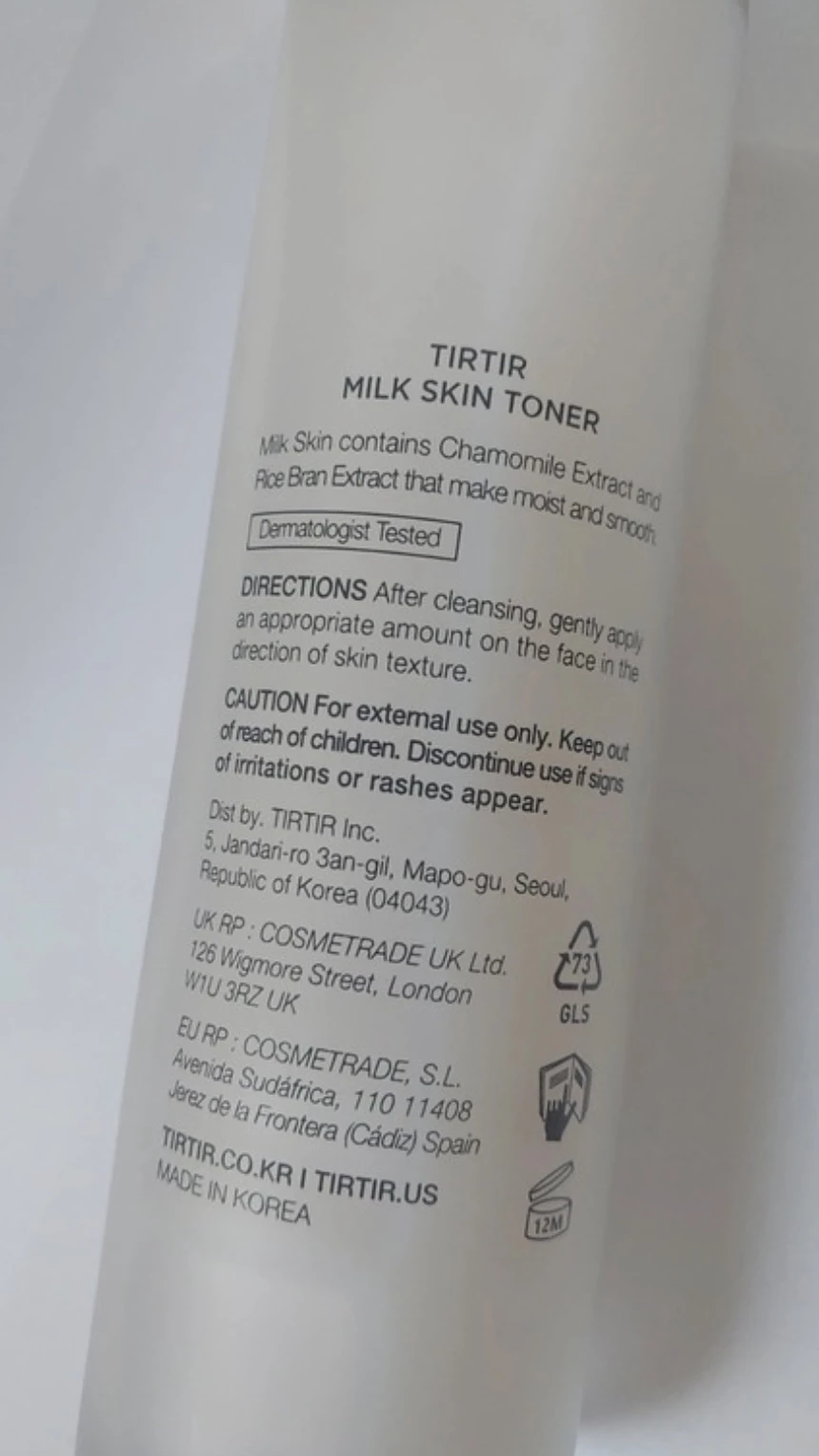 TIRTIR Milk Skin Toner este un toner hidratant si calmant, creat pentru a imbunatati sanatatea pielii si a oferi o hidratare profunda. Formula sa delicata contine ingrediente naturale precum extractul de flori de musetel si extractul de tarate de orez, care contribuie la calmarea si revitalizarea pielii, reducand roseata si oferind o senzatie de prospetime. Hamamelis Virginiana si extractul de Centella Asiatica intaresc bariera naturala a pielii, protejand-o impotriva factorilor externi.