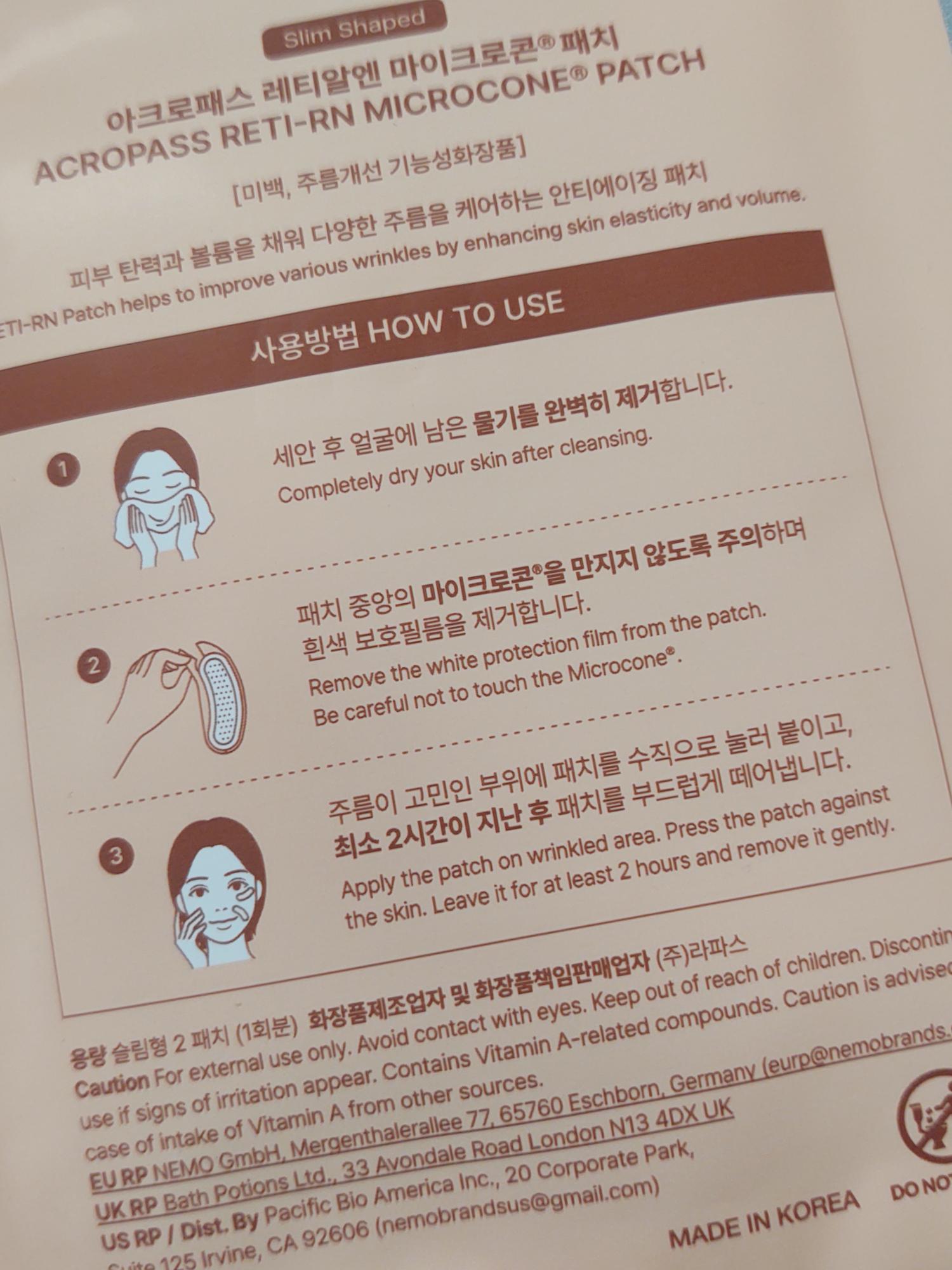 Acropass RETI-RN Microcone Patch Slim Type este un set de 6 patch-uri inovatoare destinate abordarii localizate a aspectului ridurilor si imbunatatirea elasticitatii pielii. Acestea utilizeaza tehnologia patentata Microcone, cu micro-structuri solubile care se dizolva treptat la contactul cu umiditatea pielii si permit livrarea directa a ingredientelor active in piele.