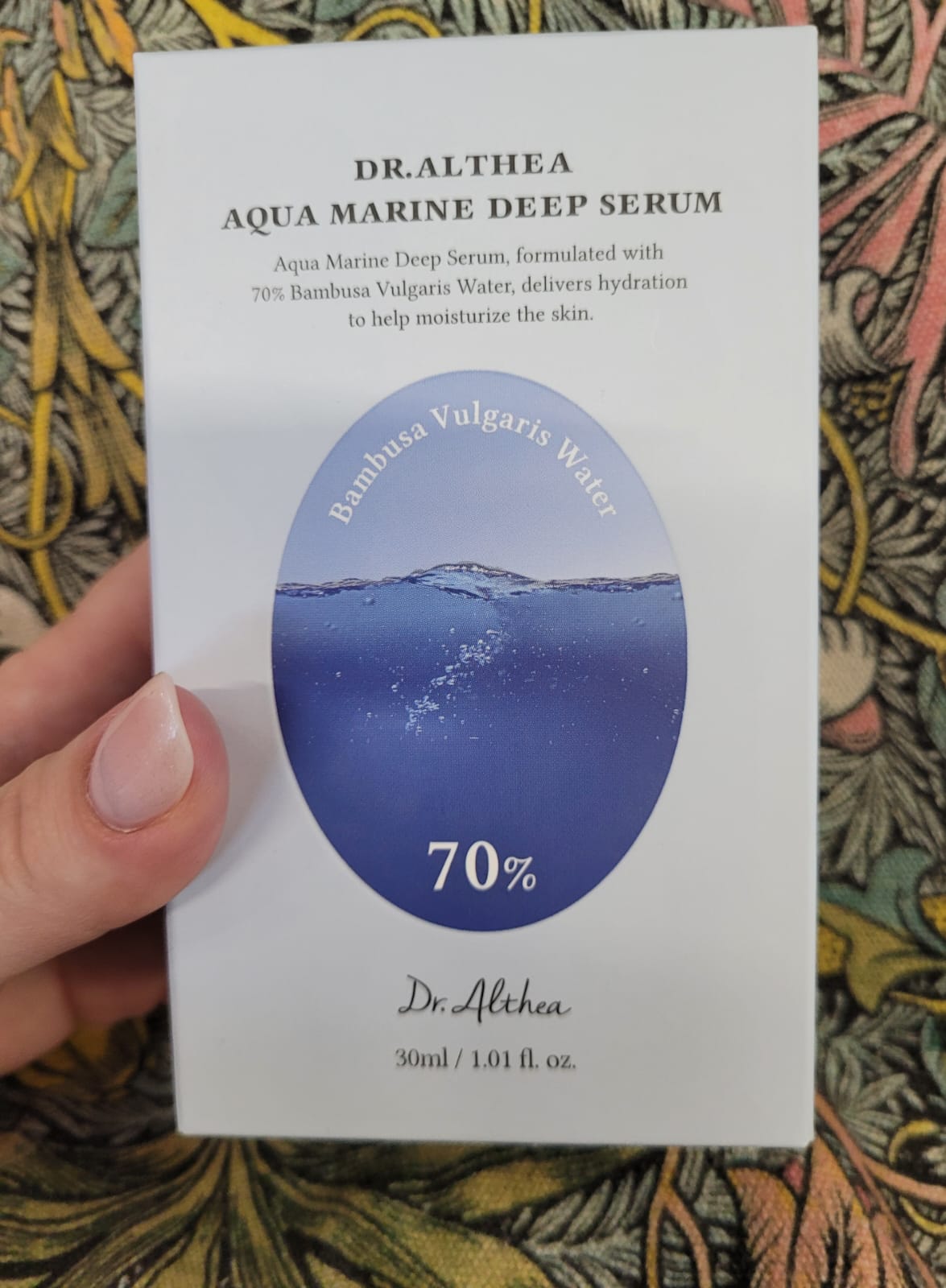 Dr. Althea Aqua Marine Deep Serum este un ser profund hidratant, formulat pentru a oferi pielii un nivel ridicat de hidratare, confort si echilibru, indiferent de tipul de ten. Formula sa se bazeaza pe 70% Bambusa Vulgaris Water (apa de bambus bogata in minerale si aminoacizi, cunoscuta pentru capacitatea sa de a hidrata intens si de a calma pielea), inlocuind apa purificata clasica, pentru a furniza pielii minerale naturale si o hidratare mai eficienta si de durata. Textura este usoara, fluida si se absoarbe rapid, lasand pielea supla, luminoasa si fara senzatie lipicioasa.