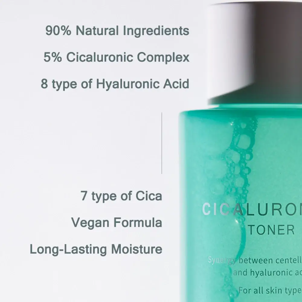 Mizon Cicaluronic Toner este un toner facial special formulat pentru a hidrata, calma si reechilibra pielea dupa curatare, fiind potrivit pentru toate tipurile de ten, chiar si pentru cel uscat si sensibil. Formula sa vegana are proprietati calmante si reparatoare datorita complexului Cicaluronic? care combina beneficiile Centellei Asiatica cu cele ale acidului hialuronic.