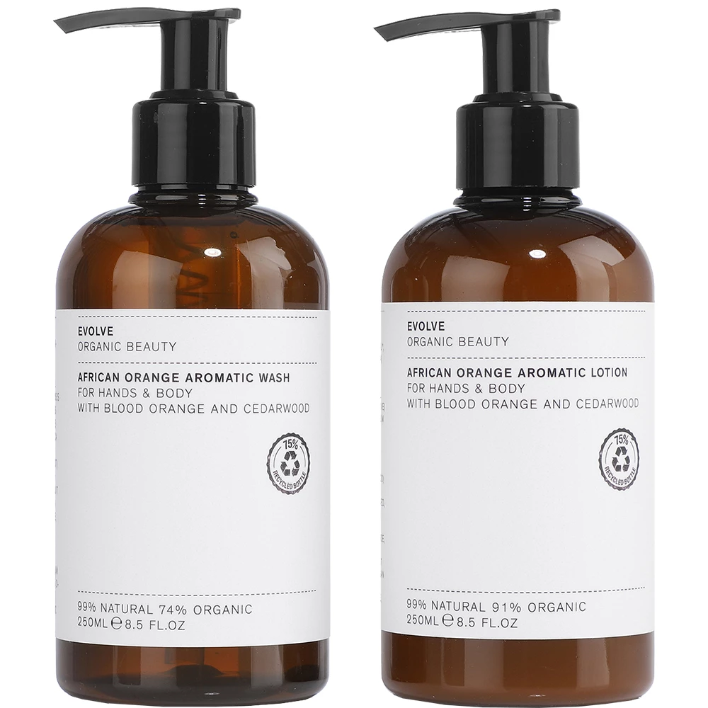 Evolve Organic Beauty ne tenteaza simturile cu setul African Orange. Parfumul natural hiptonizeaza si incarca diminetile cu energie vitala. Contine sapun lichid si lotiune hidratanta pentru maini si corp, formulate cu extract pretios suc de portocale rosii si ulei esential de cedru. Impreuna, cele doua ingrediente stimuleaza productia de colagen si cresc fluxul sanguin la nivelul capilarelor. Aroma efervescenta a portocalelor rosii are efect de aromaterapie pentru a ne calma si inveseli.