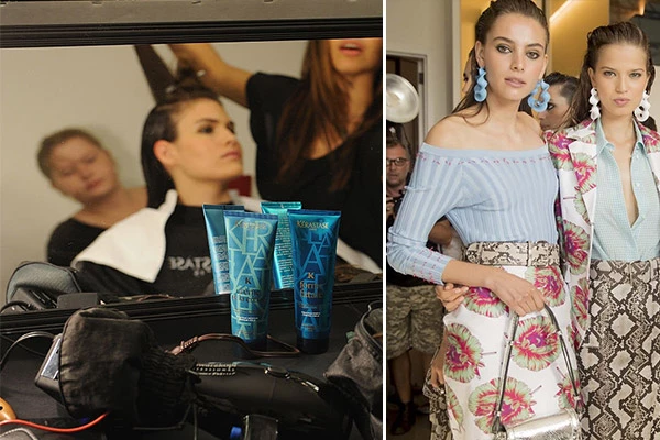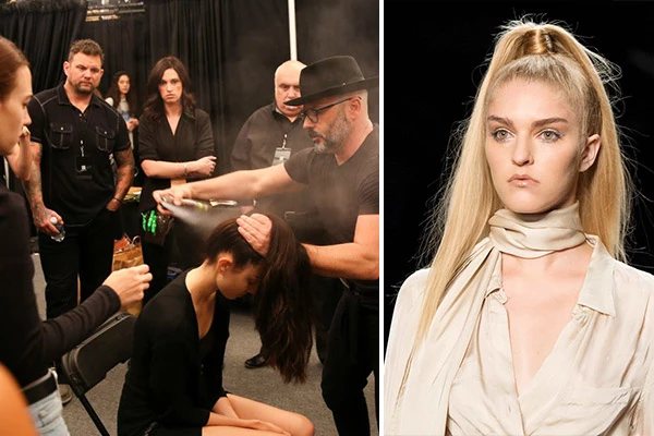 Pentru prezentarea Nicholas K, hairstylistul Giannandrea a recreat coada de cal, pe care insa a pozitionat-o in crestetul capului, pentru un aspect mai agresiv, mai pushy. Apoi, a infasurat par in jurul elasticului, iar pentru o buna stabilitate a coafurii, a folosit produsele Macadamia Professional, pe care ti le recomandam si tie. Le poti avea cu un simplu click aici.