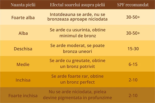 Fiecare crema, ulei, lotiune sau spray ofera moduri diferite de protectie impotriva expunerii la soare, de aceea este bine sa fii informat. De obicei, produsele de soare au afisat pe eticheta SPF-ul (Solar Protection Factor), si acesta este strans legat de doua caracteristici: tipul de piele si conditiile de expunere la soare.
