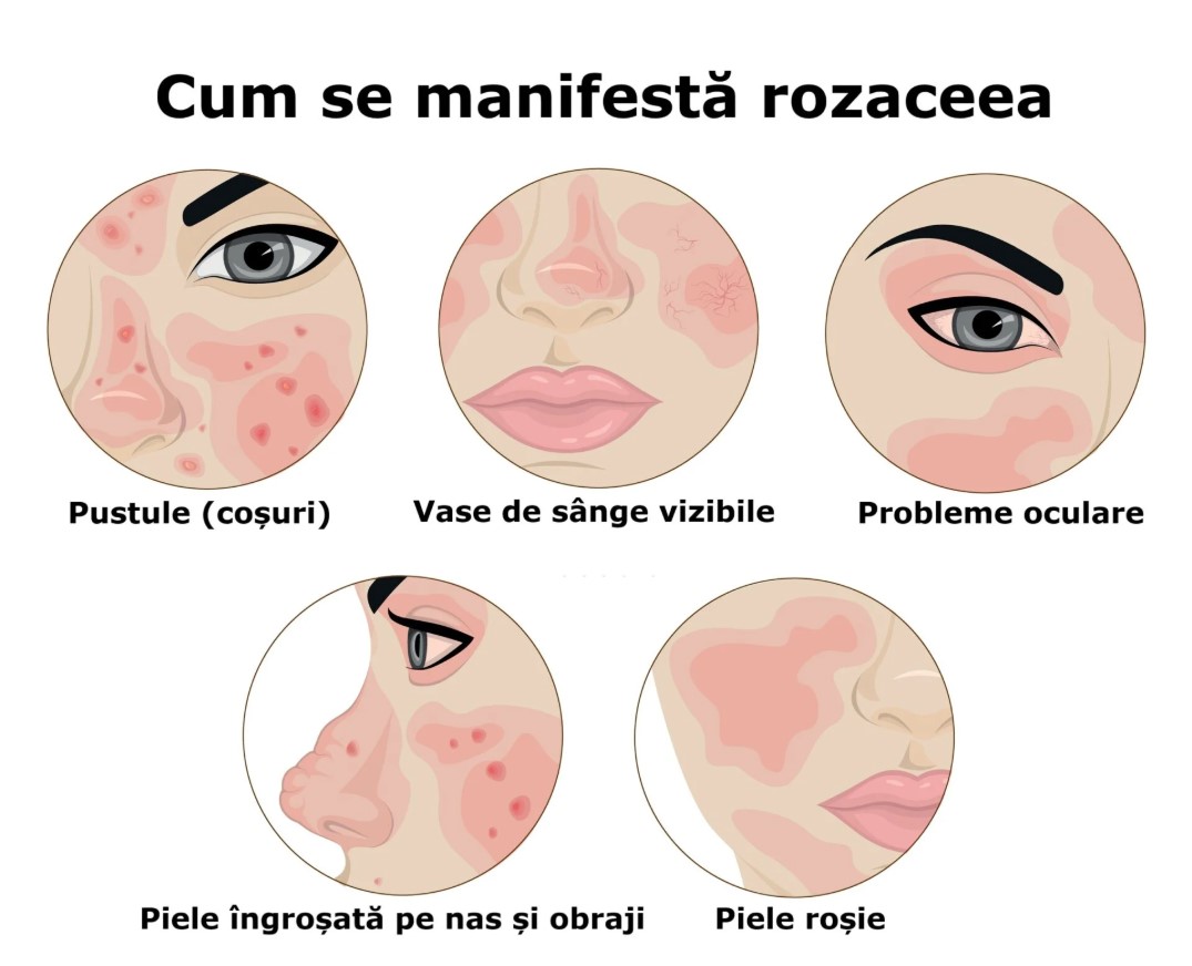 - Simptomele includ roșeață facială, vase de sânge vizibile, umflături roșii asemănătoare coșurilor și, în unele cazuri, iritații oculare.